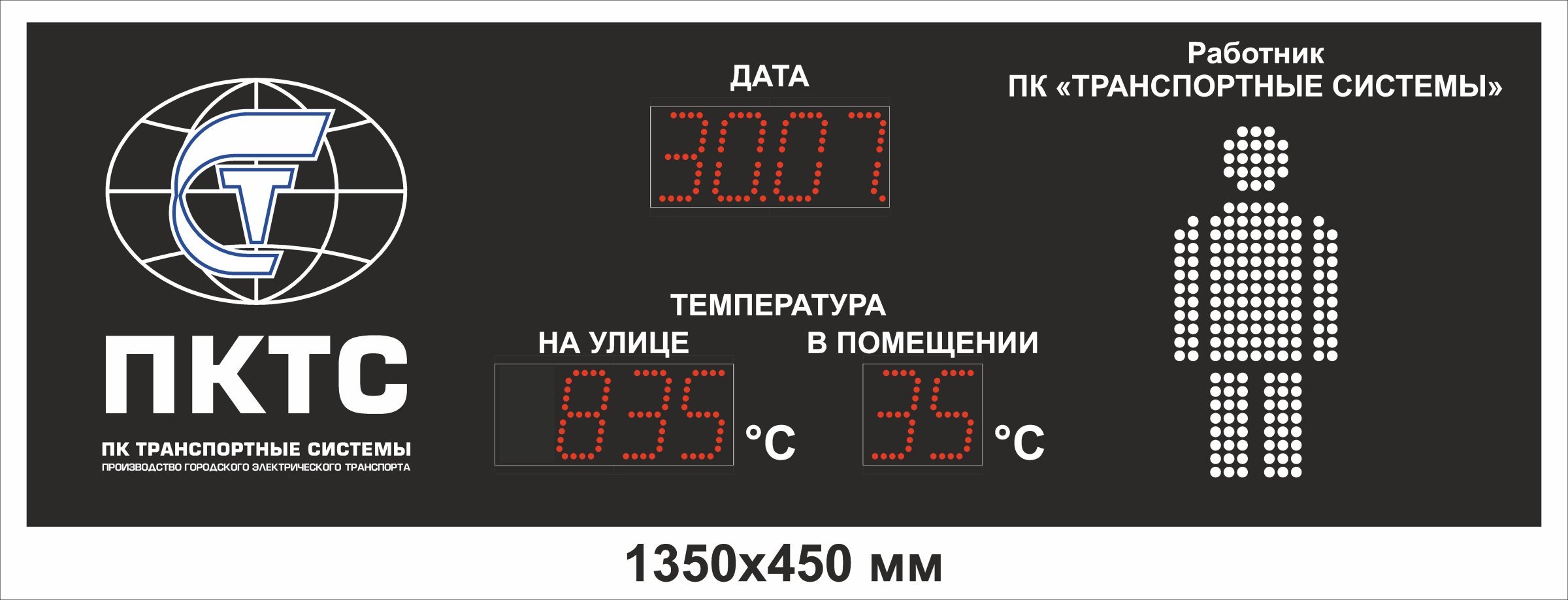 Электронное табло размером 1350x450 мм предназначено для отображения важной информации в реальном времени, включая дату, температуру в помещении и на улице, а также счетчик. Оно идеально подходит для использования в производственных и общественных местах, где необходимо оперативно информировать сотрудников и посетителей.