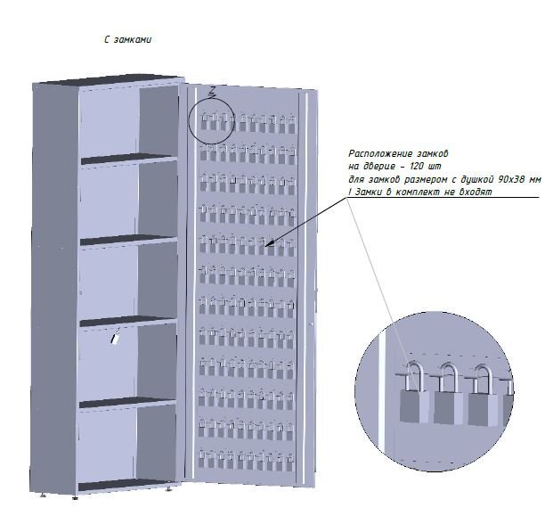 Шкаф с четырьмя полками и с подвесами для замков