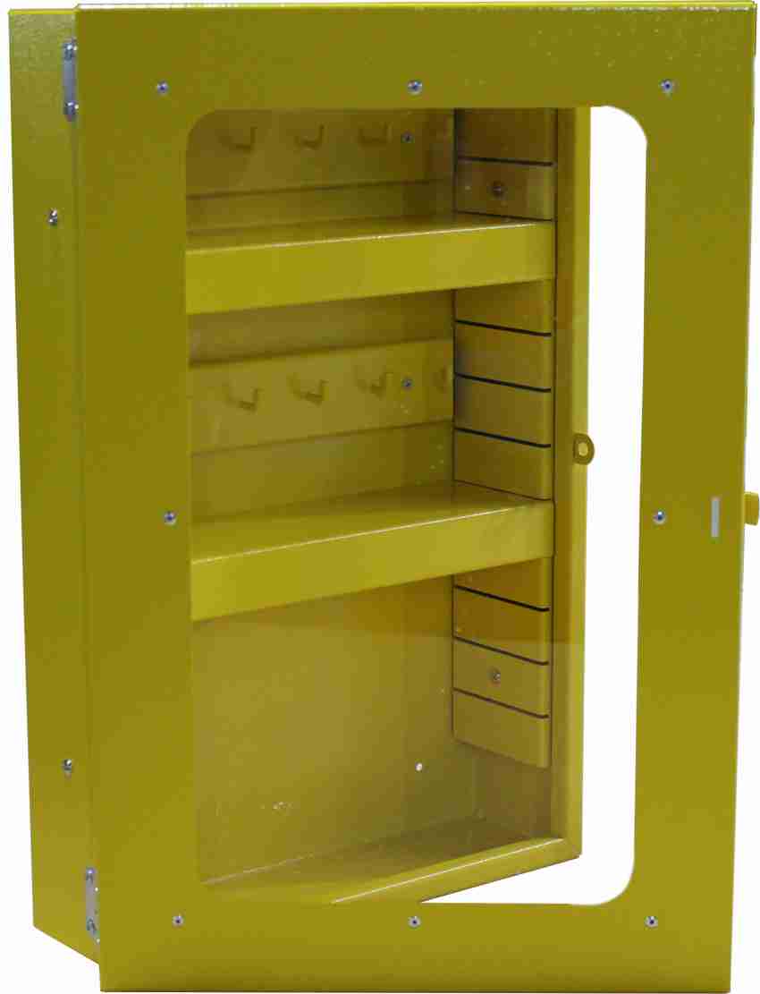 Размеры: 500x320x100,Материал: металл 1 мм., полимерная окраска, жёлтый, с крючками, оргстекло