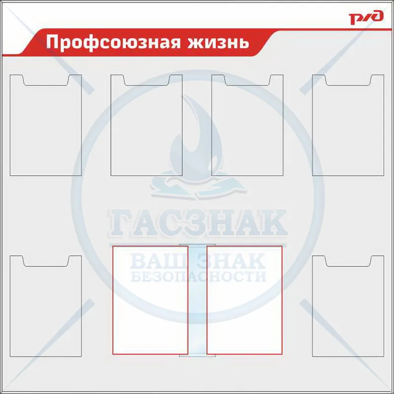 Стент РЖД Уголок охраны труда Пластик ПВХ 4 мм 900х900 (профиль алюминевый, 3 объемных кармана А4, 3 плоских кармана А4) (900х900; Пластик ПВХ 4 мм , пленка самоклеющаяся, алюминиевый профиль; Алюминиевый профиль)