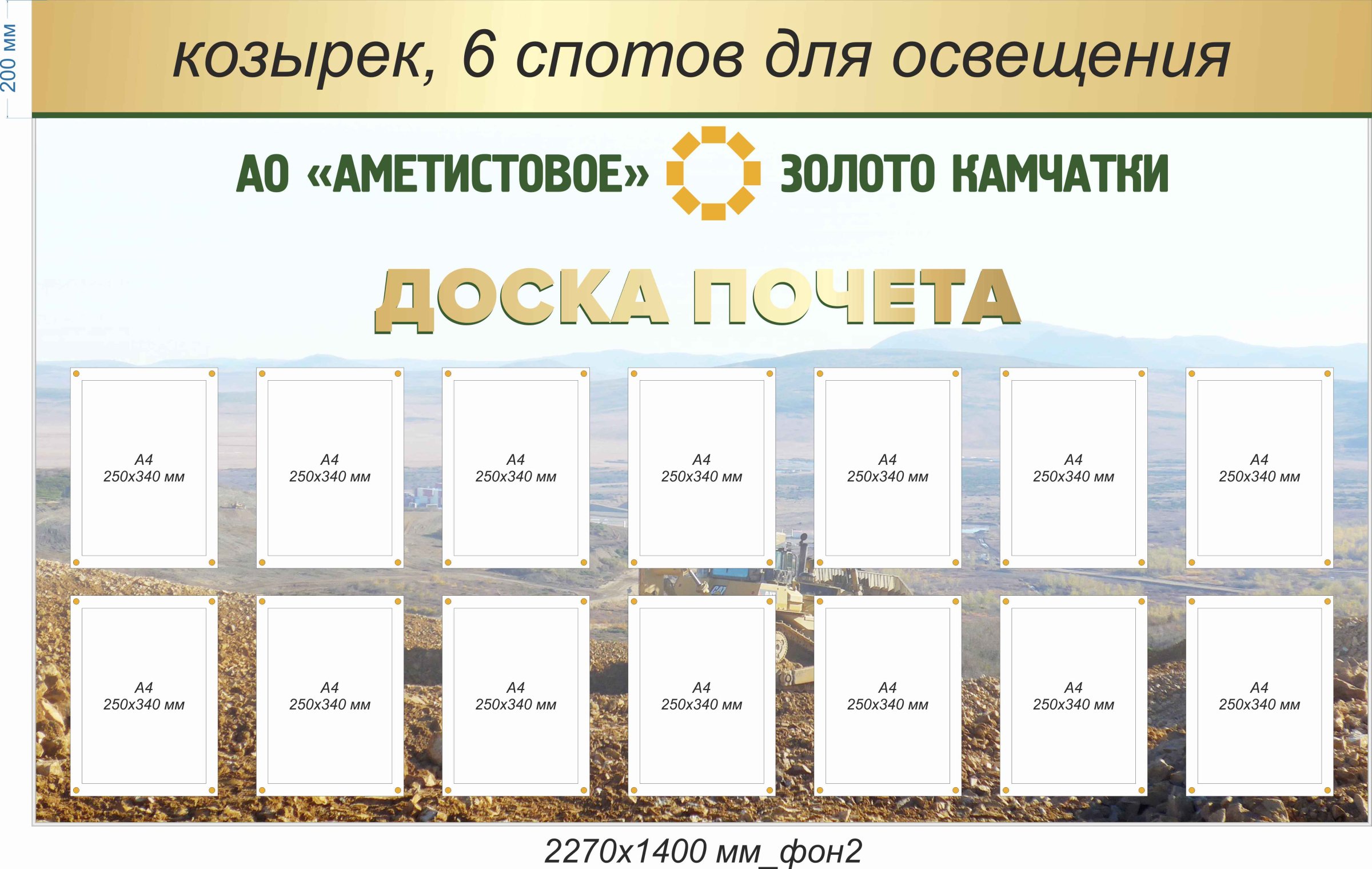 Козырек 2270х200мм, 6 спотов для освещения, карман А4 вертикальный на дистанционных держателях - 14 шт