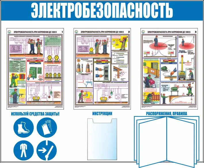 Стенды электробезопасность Электробезопасность, А2х3 шт., А4х1 шт., Перекидная система А4х10 листов (Пластик ПВХ 4 мм, алюминиевый профиль; 1500х1200)