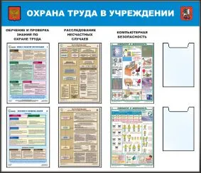 Стенд - Охрана труда в учреждении. Плакаты А3-6шт, карман плоский А4-2шт, логотип (1400х1200, Пластик ПВХ 4 мм, алюминиевый профиль)