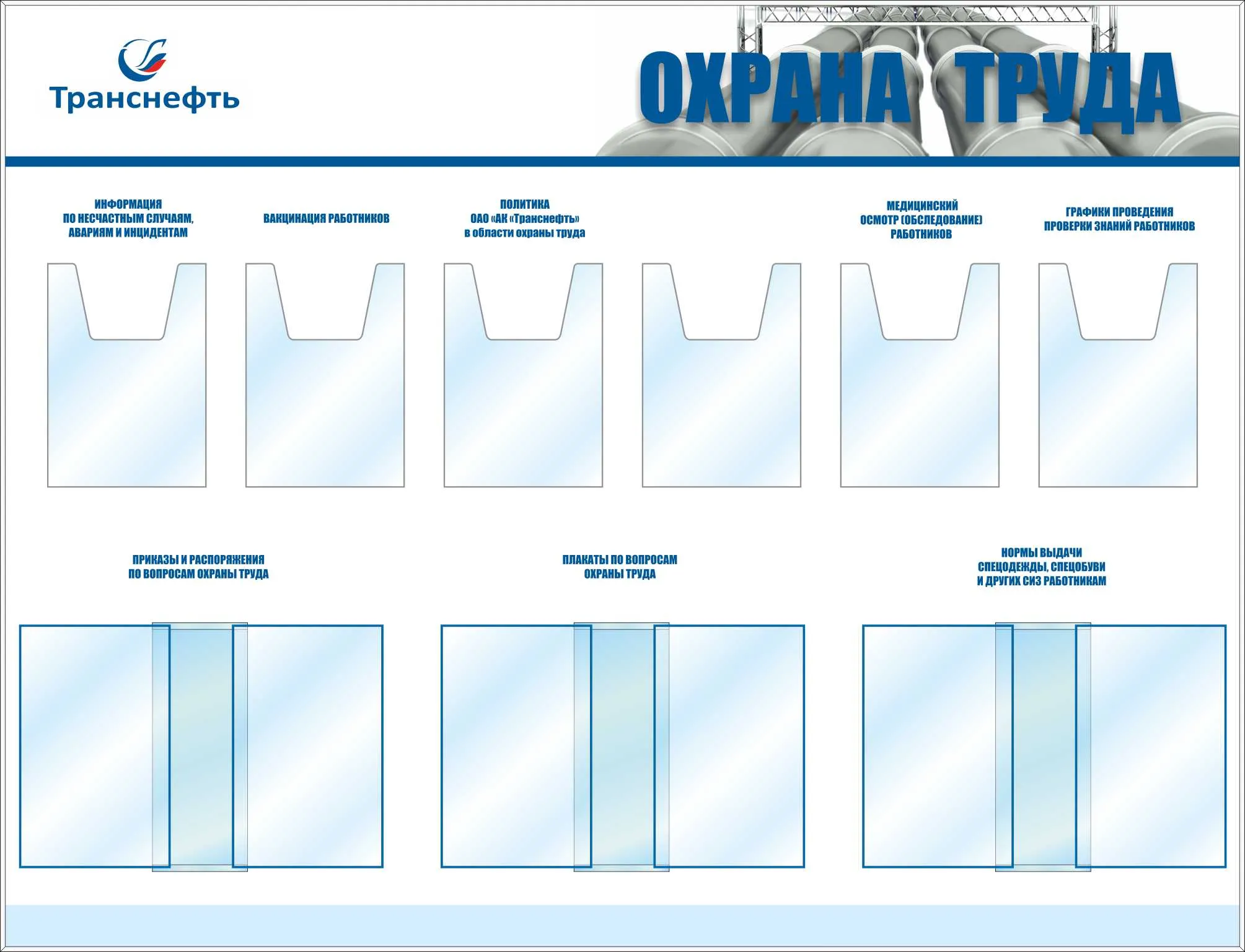 Стенд Уголок охраны труда, 6 объемных карманов формата А4, 3 перекидные устройства формата А4 на 5 листов (1700х1300; Пластик ПВХ 4 мм,Алюминиевый профиль)
