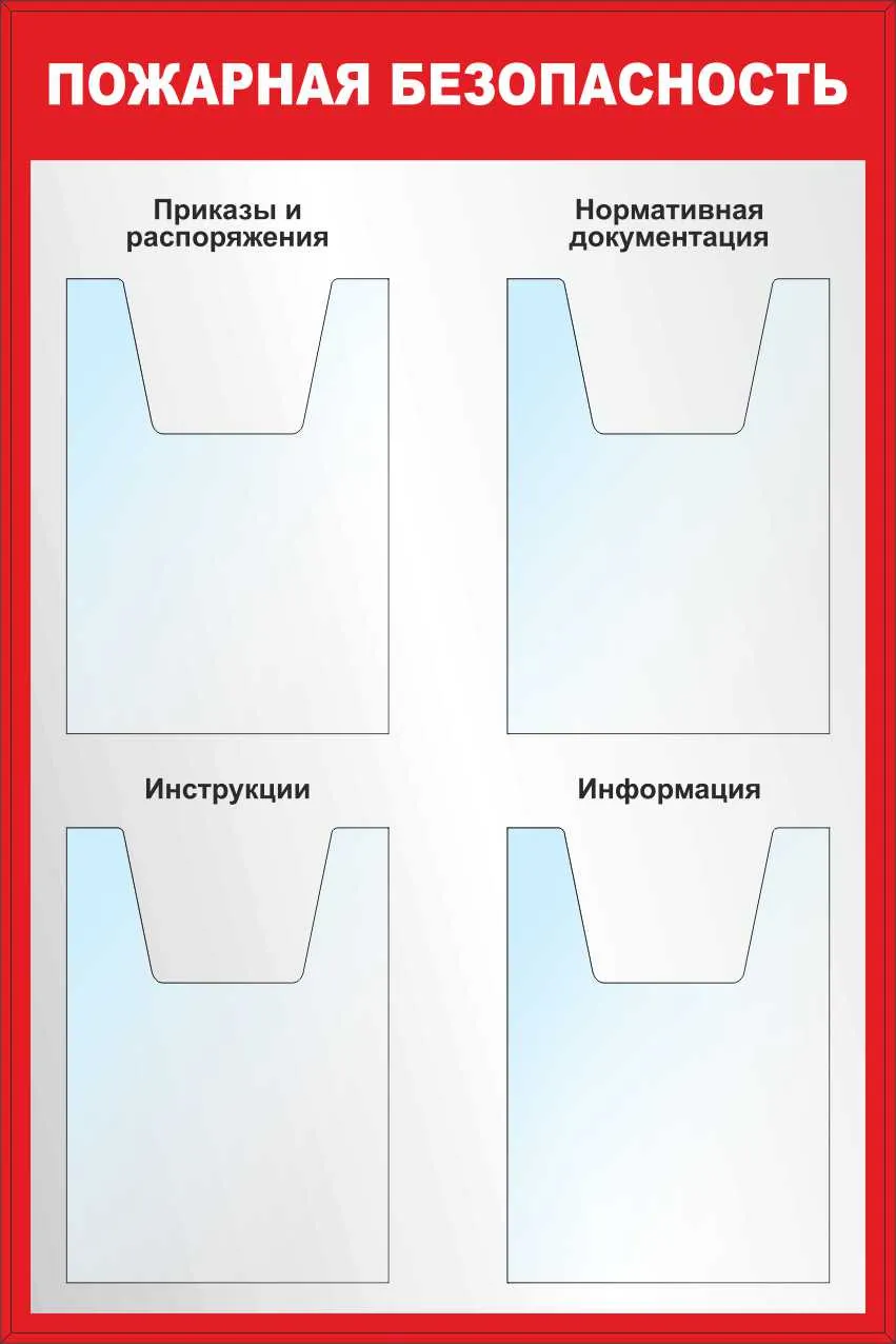 Стенд Пожарная безопасность, карман А4 плоский-5шт, карман А4 объемный - 2шт,перекидная система А4 на 10 рамок (1400х1200; Пластик ПВХ 4 мм, алюминиевый профиль; Алюминиевый профиль)