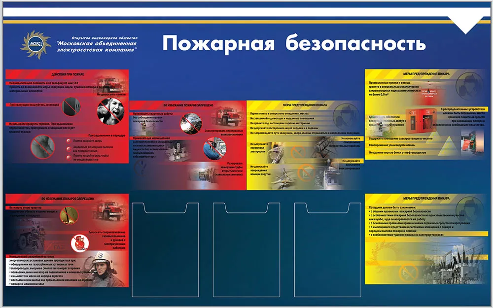 Стенд Пожарная безопасность, 6 горизонтальных плакатов А3, 5 карманов А4, Логотип (1500х1200; Пластик ПВХ 4 мм, алюминиевый профиль; Алюминиевый профиль)