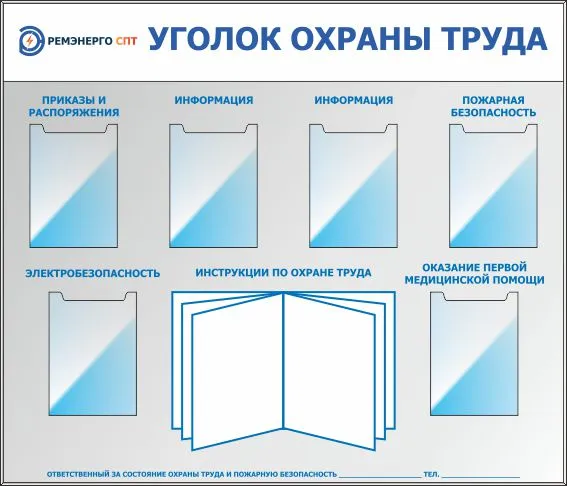 Стенд по охране труда Уголок охраны труда Алюминиевый профиль серебро Перекидная система с 5 панелями А4; Карман А4; Ремэнерго (Пластик ПВХ 4 мм 1400х1200)