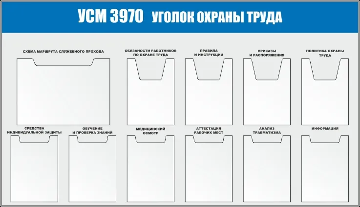 Стенд Уголок охраны труда в индивид. упаковке, карманы плоские А4 -6шт, перек. система А4 на 6 рамок (1400х1200; Пластик ПВХ 4 мм; Профиль ластиковый синий)
