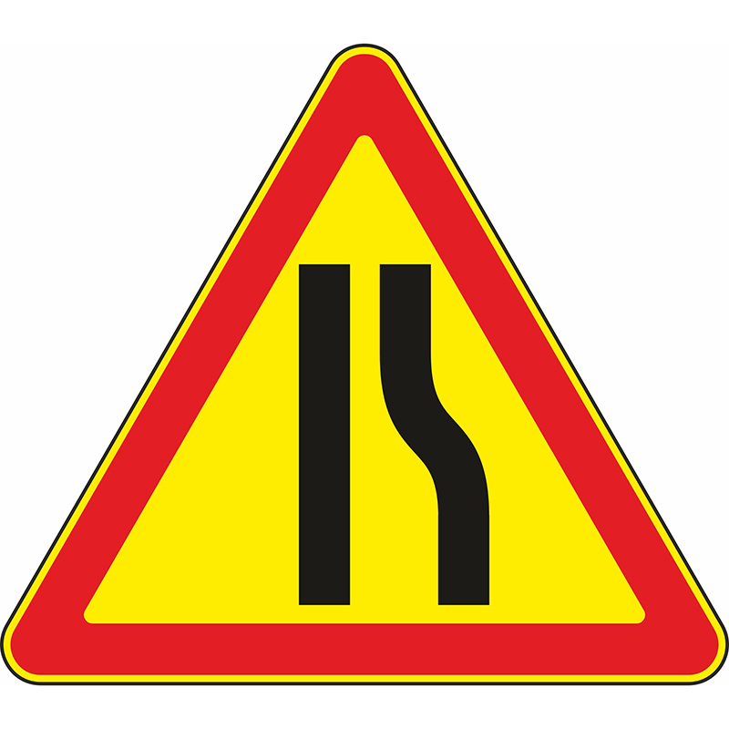 При проведении ремонтных работ на дороге или возникновении затора из-за ДТП, когда необходимо объехать пострадавшие транспортные средства, возможно сужение проезжей части. Об этом водителю сообщает знак с соответствующим значением — «Сужение дороги справа». Его устанавливают в пределах населенных пунктов на удалении примерно 50–100 м от места, где дорога начинает сужаться, вне населенных пунктов — на большем удалении: до 150–300 м. Если из-за уменьшения ширины дорожного полотна водителю для проезда дальше необходимо перестроиться, требуется подождать, пока проедет встречный транспорт, которому перестраиваться нет необходимости.