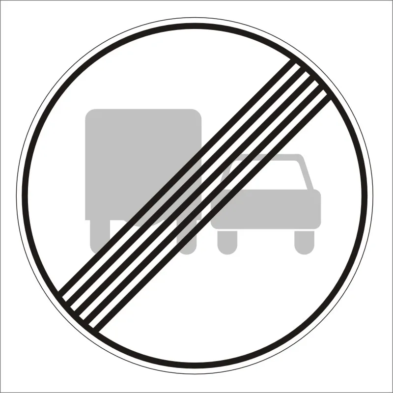 «Конец запрещения обгона грузовым автомобилям» — один из знаков, имеющих отменяющее действие: отменяет введенный до этого запрет на совершение маневра. Проехав его, водитель грузовой машины вправе начинать обгон другого транспорта, если есть возможность совершить маневр с соблюдением ПДД. Знак используется лишь в тех ситуациях, когда не нужно продолжать зону действия запрета до следующего перекрестка или границы населенного пункта. Может размещаться не только на левой, но также на правой стороне дороги.