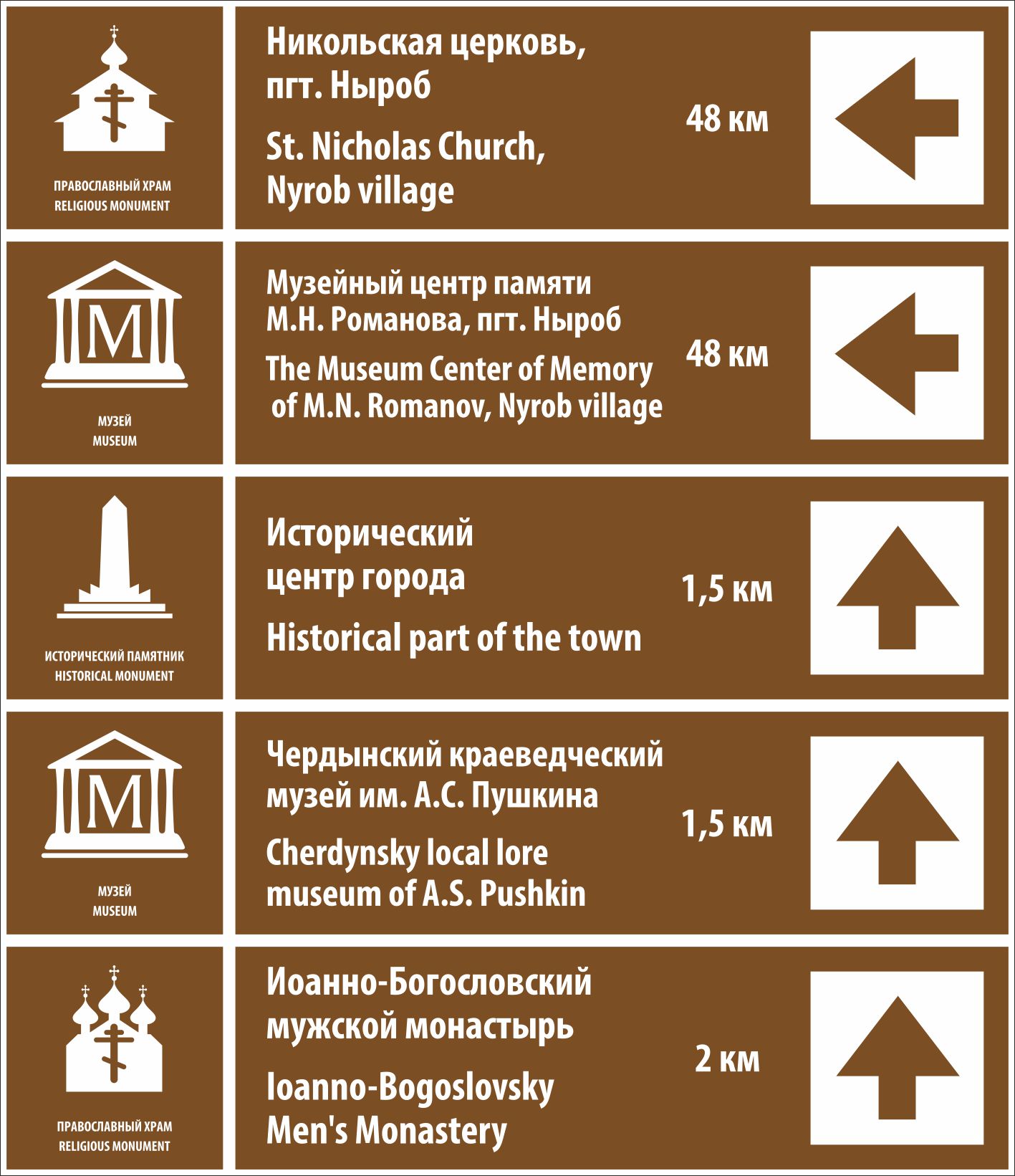 Указатель направления "Никольская церковь, пгт. Ныроб, 48 км, Музейный центр памяти М.Н. Романова, пгт. Ныроб, 48 км, Исторический центр города, 1,5 км, Чердынский краеведческий музей им. А.С. Пушкина, 1,5 км, Иоанно-Богословский монастырь, 2 км" (1640х1900; Металл 0,8 мм оцинкованный, световозвращающая пленка типа А ГОСТ Р 52290-2024; ), рама по периметру с креплением под 1 стойку